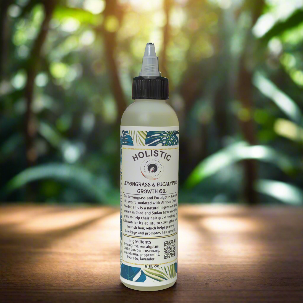 Our Lemongrass & Eucalyptus Growth Oil is a specially formulated hair care product that is designed to nourish, strengthen, and promote healthy hair growth. This oil contains African Chebe Powder, a natural ingredient used for generations by women in Chad and Sudan to achieve healthy locks.